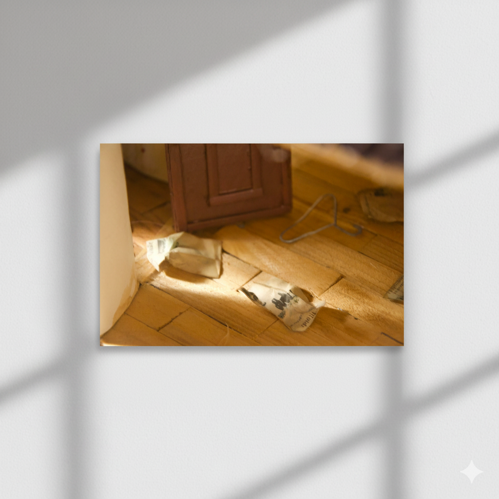 Ce tirage est la 2e photographie de la série "Hope you're okay" d'Alixe Gauvin, crée en 2022. La série nous emmène en balade à l'intérieur d'une maison abandonnée, mais ce n'est pas ce que l'on pourrait croire. L'artiste a méticuleusement construit cette maison en miniature, la faisant vivre à travers des détails et des scènes capturées en photo.