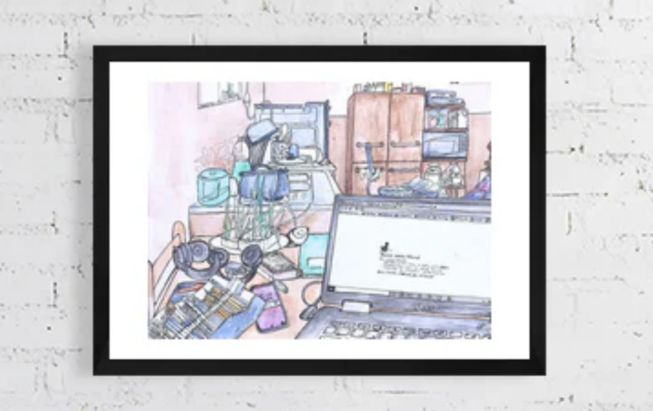Crée en 2020, "On monday" est un dessin à l'aquarelle qui capture la vue de la cuisine où l'artiste a passé beaucoup de temps à la fin du confinement. Plus qu'une simple représentation d'une pièce, cette œuvre exprime la lassitude et le sentiment d'être confiné dans un espace que l'on n'aime pas.